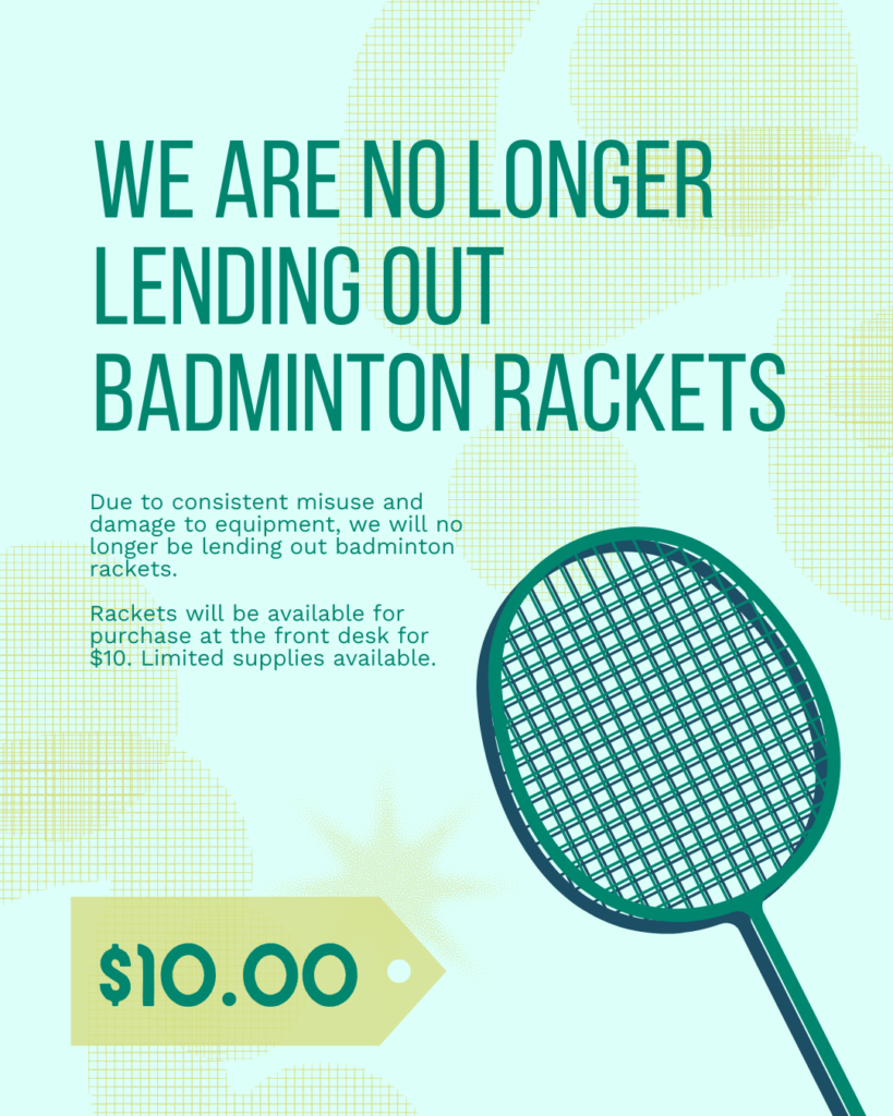Please note we are no longer lending out badminton rackets due to misuse and damage to our equipment. If you would like to purchase at racket, you can do so at the front desk. Limited supplies available.